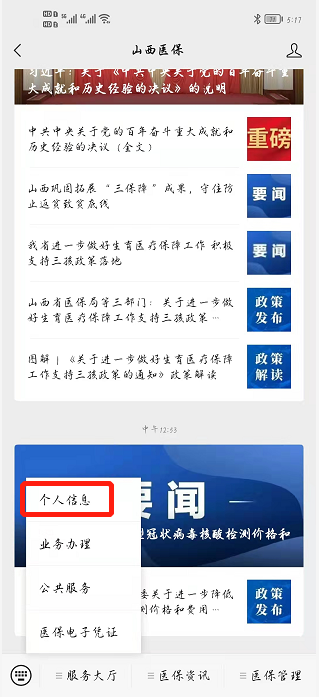 第一步:微信搜索山西医保公众号并关注,进入公众号首页找到“服务大厅”点击“个人信息”入口,填写个人信息,进行注册登录。