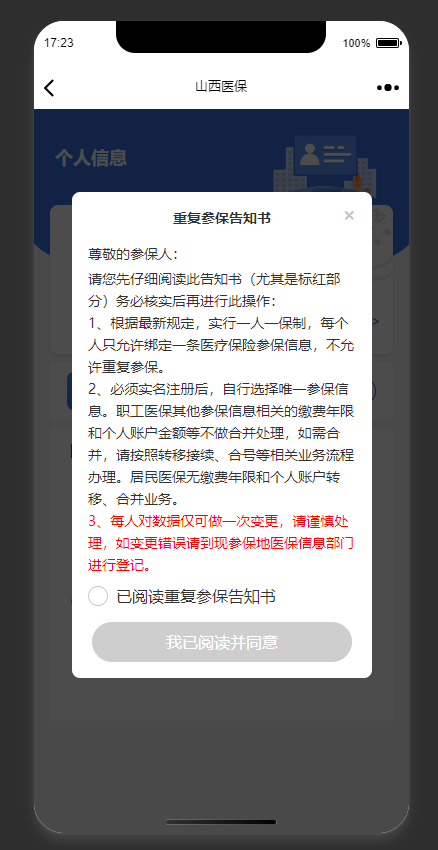 第三步:仔细阅读重复参保告知书,并点击“我已阅读并同意”,完成风险告知。