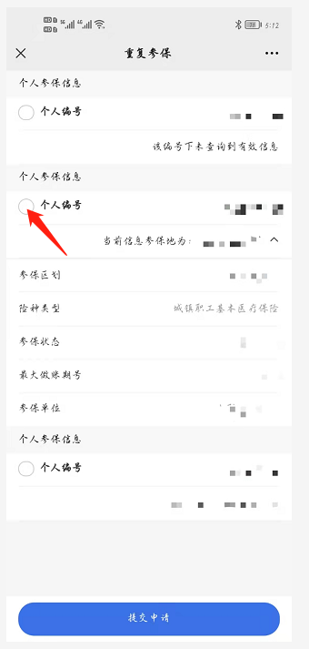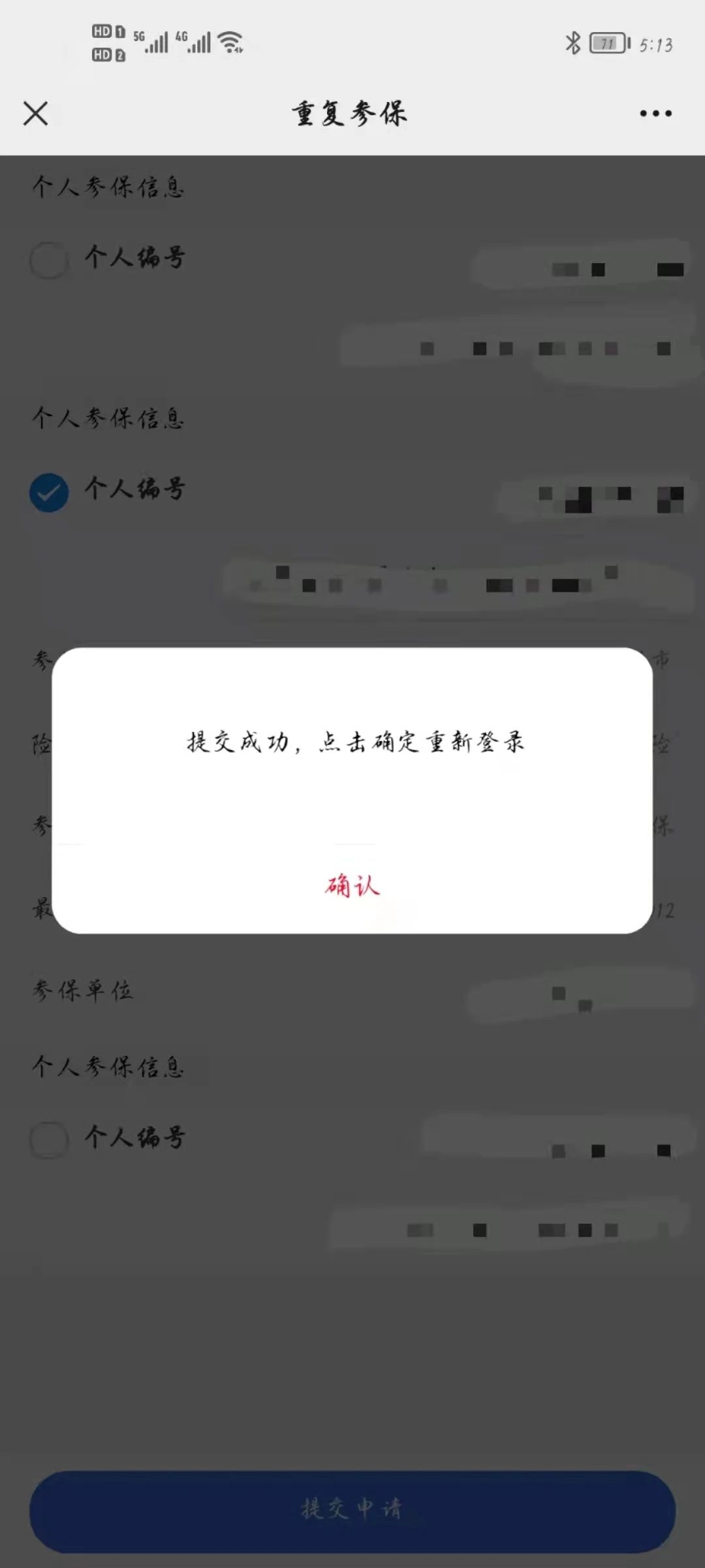 第四步:在“重复参保”页面所列出所有的个人参保信息中,核对需要保留的参保信息进行确认并“提交申请”。