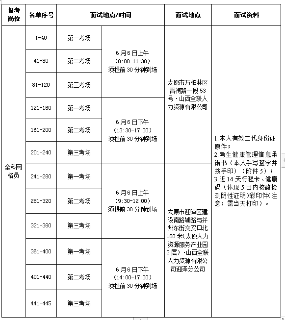 由于处于疫情期间,面试根据迎泽区社区专职网格员笔试考试成绩名单序号(资格复审合格)分为上午场和下午场。