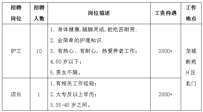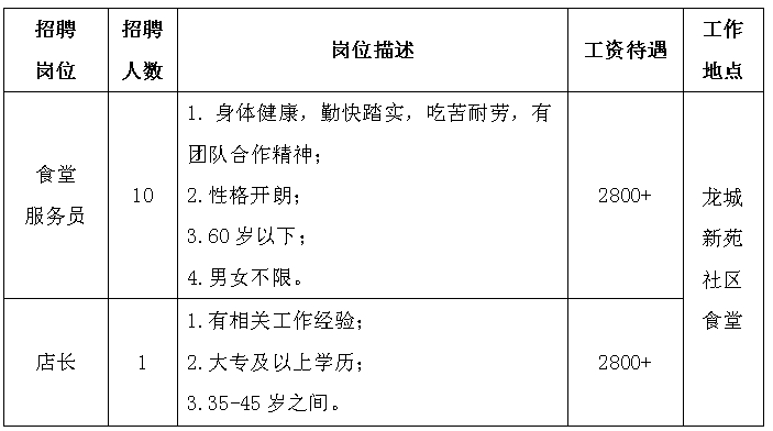 根据业务工作拓展的需要龙城新苑养老服务中心和龙城新苑社区食堂,现面向社会招聘工作人员。